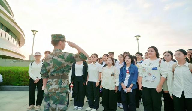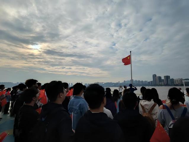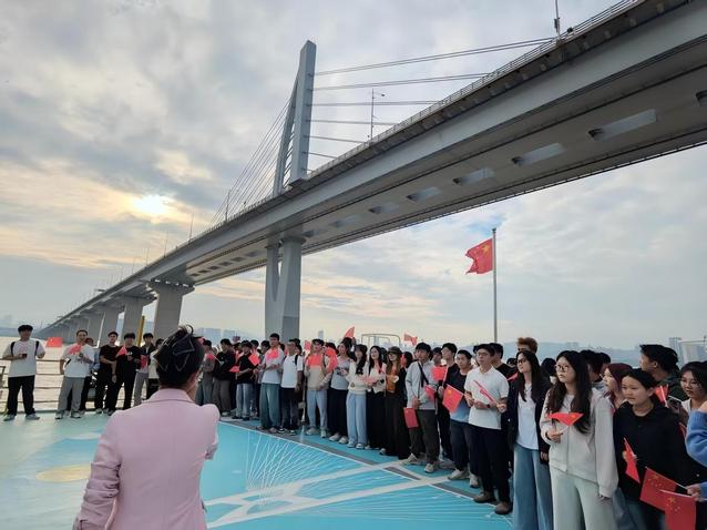 与此同时,2024级师生在伶仃洋游轮甲板上隆重举行升旗仪式。冉冉升起的五星红旗,与远处的珠海城市轮廓、雄伟的港珠澳大桥构成一幅壮丽画面。全体师生肃立,高唱国歌,满腔的爱国豪情在心中激荡,大家共同许下“扎根湾区,建设祖国”的庄严誓言,让红色基因深深融入青春血脉。