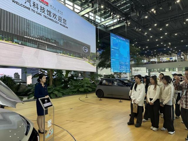午后,研学团队在校友的引领下走进广汽科技馆。从新能源整车、智能网联技术到轻量化零部件与氢燃料电池系统,一系列尖端科技成果令同学们目不暇接。大家观察精密汽车模型的动态演示,聆听由工业机器人演奏的悠扬古筝乐曲,在科技与艺术融合的氛围中,深切感受到智能制造带来的革新魅力。