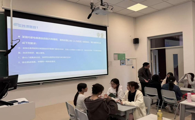 理论赋能之后,活动迅速转入“情景实践”环节。在专业教师的指导下,学生们分组扮演面试官与应聘者角色,围绕真实招聘需求展开全流程模拟。从职位分析、设计问题清单,到实际提问、观察评估,再到合议决策、给予反馈,同学们亲身体验了人力资源专业工作的核心环节。